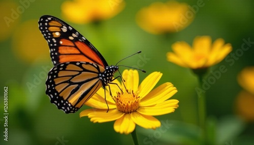 A monarch butterfly sips nectar from a bright yellow flower, nature, flowers, bees
