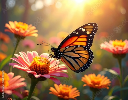 butterfly, monarch, flower, zinnia, garden, nature, insect, summer, beautiful, vibrant, colourful, pink, orange, sunlight, bloom, flower petals, nectar, wing, flying, delicate, blooming, natural, pretty, spring, warm, sunny, peaceful, happy, bright, creative, modern, elegant, stylish, professional, decorative, stunning, amazing, marvellously, fantastic, gorgeous, lovely, charming, attractive, impressive, spectacular, magnificent, excellent