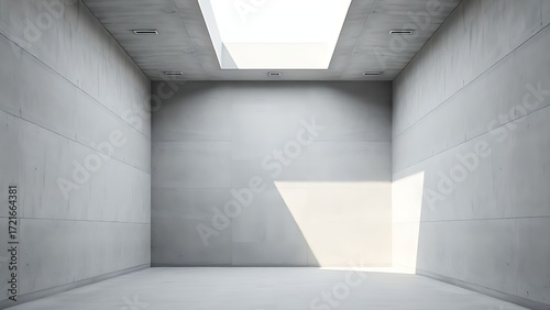 A monochrome concrete interior with clean lines and geometric shadows, illuminated by natural skylight.