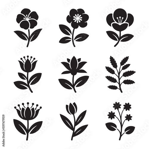floral, flower, design, monochrome, illustration, vector, black, white, botanical, nature, plant, leaf, graphic, symbol, icon, art, drawing, silhouette, simple, element, decorative, isolated, clip art, pattern, background, artwork, shape, style, line, outline, set, collection, ornament, spring, garden, feature