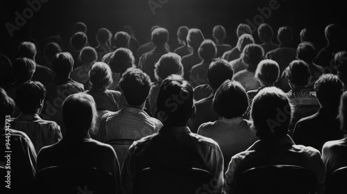 monochrome, people, seated, oneness, anticipation, event, together, backview, meeting, audience, group, indoor, observation, waiting, cinematic, vintage, classical, gathering, crowd, contrast, shadow, hearer, focused, engaged, silent, thoughtful, reflective, nostalgic, film, serious, concert, 1960s, silhouette, concert hall, old time, sharpened