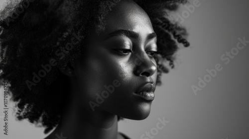 A monochrome portrait of a woman with textured hair, conveying emotion and introspection.