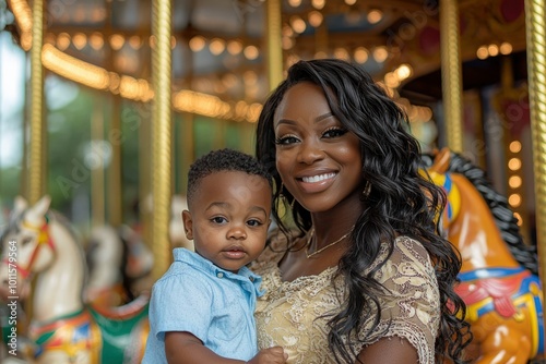 mother, son, carousel, ride, amusement, park, fair, fun, happy, family, smile, love, young, children, boy, girl, woman, children, black, african, american, white, light, blur, background, light, bright, colourful, dress, lace, blue, shirt, hair, eye, brown, skin, joy, happiness, together, cute, adorable, childhood, pose, portrait