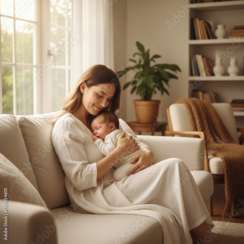 mother, baby, newborn, infant, children, love, care, tenderness, affection, family, home, comfort, peace, serenity, calm, contentment, happiness, joy, warmth, bond, connection, maternal, gentle, peaceful, cosy, domestic, indoor, living, room, sofa, couch, white, dress, woman, female, sleep, resting, holding, hugging, closeup, portrait, natural, light