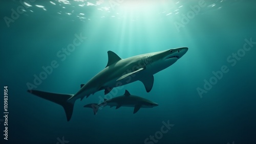 A mother shark swimming alongside her pup, highlighting their bond in the open ocean with gentle sunlight filtering through the water.