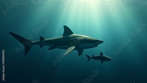 A mother shark swimming alongside her pup, highlighting their bond in the open ocean with gentle sunlight filtering through the water.