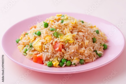 A mound of fried rice, colorful and savory, sits on a pink plate