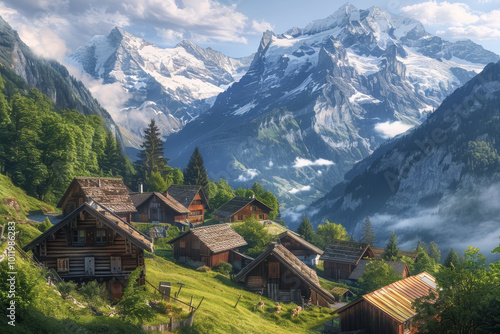 mountain, village, house, tree, small, wooden, landscape, blue, snow, shining, sky, nature, sun, travel, summer, green, tour tourism, europa, view, beautiful, vacation, grass, peak, forest, swiss, scenery, hiking, scenic, background, meadow, panorama, rural, white, cloud, park, vale, european, countryside, hill, spring, cold, autumn, environment, field