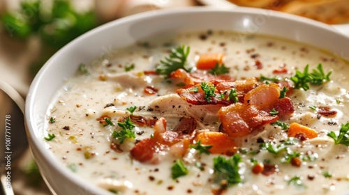 A mouthwatering bowl of creamy chicken and wild rice soup garnished with crispy bacon and chopped parsley, Soup bowl centered