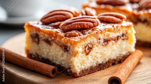 A mouthwatering pecan cake slice topped with whole pecans, set on a wooden board, invites you to indulge in its rich flavors and delightful textures for a perfect dessert experience.