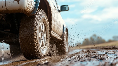 A muddy tire splashes through wet terrain, showcasing thrill of off road driving. image captures excitement and adventure of exploring rugged landscapes.