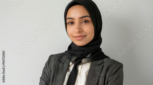 A Muslim woman dressed neatly as a businesswoman. A beautiful black veiled woman looks at the camera.