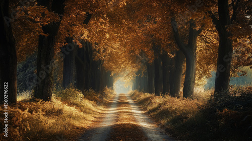 A mysterious autumn woodland path, where towering trees cast deep shadows over the road, creating an enchanting journey