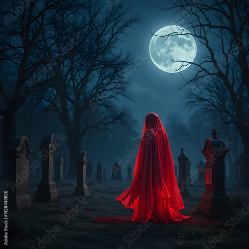 cemetery, cemetery, figure, mysterious, night, moonlit, full moon, gothic, horror, eerie, skittish, gravestone, headstone, dark, atmospheric, misty, foggy, bare trees, supernatural, fantasy art, digital artwork, illustration, red, black, mystery, haunting, death, solitude, cloak, shroud, anonymous, sombre, creepy, moonlight, night scene, artwork