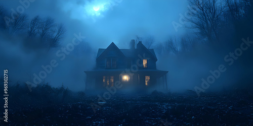 A mysterious house shrouded in fog, illuminated by a single glowing window, evokes an eerie and haunting atmosphere.