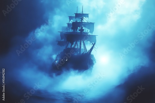 A mysterious ship emerges from the dense fog, creating an eerie atmosphere on the calm sea at twilight.