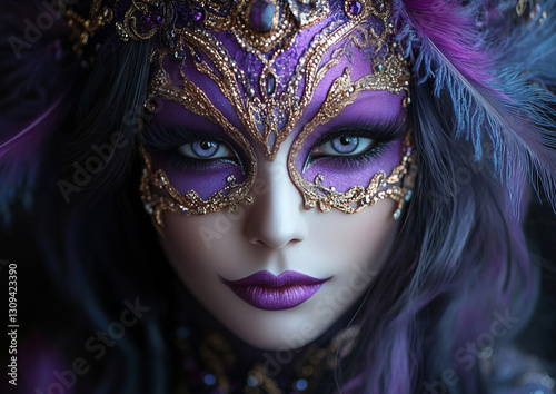 A mysterious woman with flowing hair wears an elaborate Venetian mask in shades of purple and gold, her glowing dark eyes framed by feathered accents against a dramatic black backdrop.