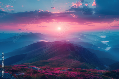 A mystical ethereal horizon with glowing mountains and a vibrant sky,
