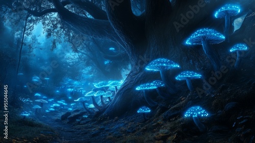 forest, nature, magical, mystical, fantasy, timberland, path, trail, tree, leaf, dark, night, blue, glow, light, bright, illumination, mushroom, fungal, spore, cap, stem, fairy tale, magic, enchanted, dreamlike, aethereal, surreal, atmosphere, ambience, mood, mysterious, shadowy, serenity, peace