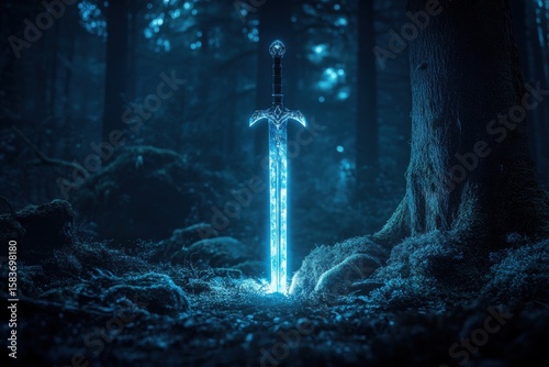 sword, glowing, mystical, forest, twilight, moss, dark, tree, fantasy, light, weapon, nature, magical, blue, illumination, enchanted, adventure, timberland, aethereal, calmness, scenery, mythical, archaeology, exploration, legend, ancient, night, wilderness, secret, beauty, serene, ambience, shadow, forest floor, creative, calm, stillness