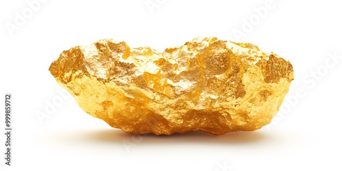 A natural gold nugget with a gleaming metallic luster is isolated on a white background. The detailed macro photography highlights its rough texture, irregular shape, and symbolic wealth.