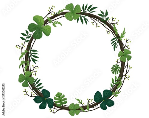 A natural wreath of twisted branches with green foliage and shamrock leaves.