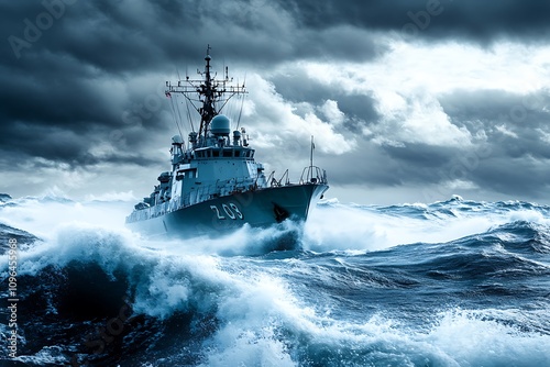 A naval ship battles rough seas under a dramatic sky, showcasing maritime resilience.