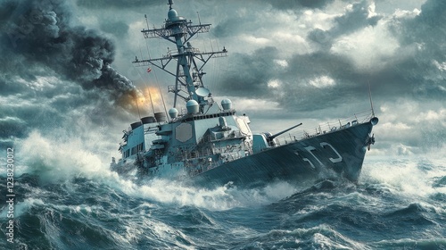 A naval ship with a high-powered radio antenna transmitting across the ocean