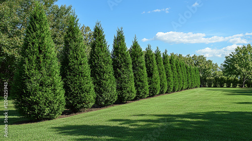 A neat row of lush arborvitae trees serves as a natural privacy screen in a tranquil suburban backyard. Generative AI