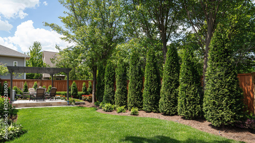 A neat row of lush arborvitae trees serves as a natural privacy screen in a tranquil suburban backyard. Generative AI