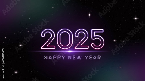 A neon 2025 Happy New Year greeting against a black background with stars.
