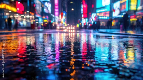 A neon cityscape at night, with vibrant lights in every shade reflecting off wet streets.
