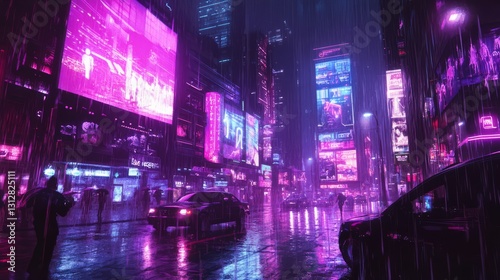 A neon cityscape with a car driving down a wet street. Scene is futuristic and vibrant
