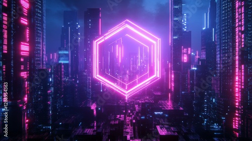 A neon hexagon wireframe shape floating over a dark futuristic cityscape. 3D rendering.