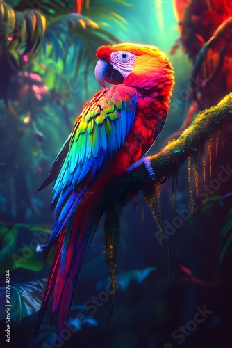 A neon parrot, glowing in vibrant reds, blues, and yellows, perches on a glowing green branch in a neon rainforest