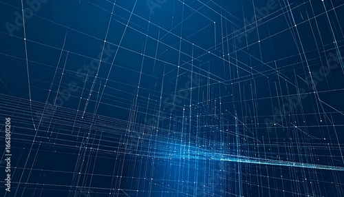 A network of interconnected lines and points creates a sense of depth and dimensionality in a dark blue setting.