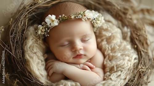 A newborn baby girl sleeps peacefully with a flower crown, in a nest-like setting.
