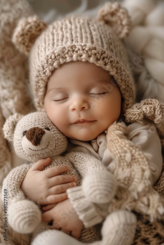 children, person, cute, innocence, toy, sleeping, newborn, childhood, teddy bear, bear, baby, blanket, small, infant, bed, comfortable, soft, adorable, boy, horizontal, one person, sleep, happiness, care, little, portrait, lifestyle, dream, beauty, indoor, resting, teddy, asleep, dreaming, fluffy, love, cosy, softness, knitted, beige, hat, birth, hugging, textile, caucasian