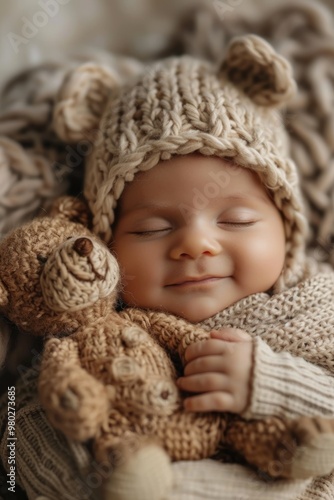 children, person, cute, innocence, toy, sleeping, newborn, childhood, teddy bear, bear, baby, blanket, small, infant, bed, comfortable, soft, adorable, boy, horizontal, one person, sleep, happiness, care, little, portrait, lifestyle, dream, beauty, indoor, resting, teddy, asleep, dreaming, fluffy, love, cosy, softness, knitted, beige, hat, birth, hugging, textile, caucasian