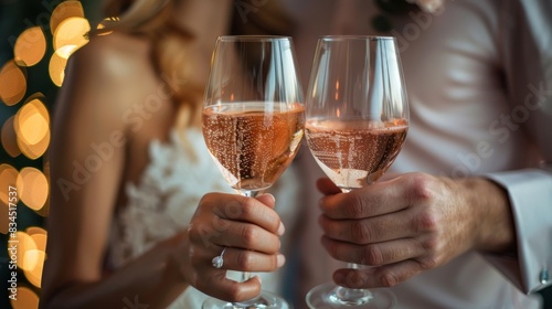 A newlywed couple shares a glass of pink Moscato, their wedding rings visible on their left hands. wedding celebration, filled with love and joy.