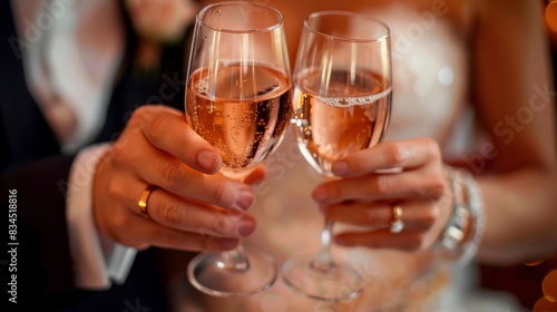 A newlywed couple shares a glass of pink Moscato, their wedding rings visible on their left hands. wedding celebration, filled with love and joy.