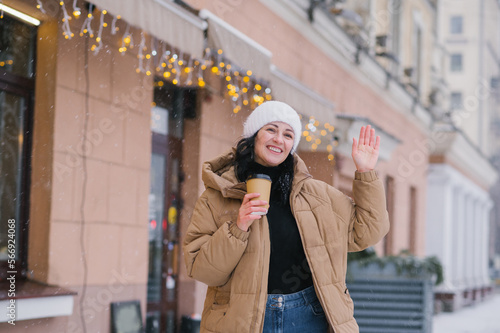 A nice woman walks through the city in winter with a cup of coffee and waves her hand