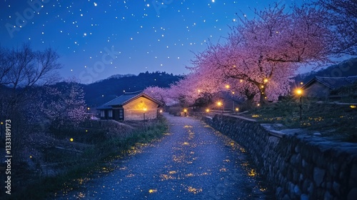 night, star, sky, tree, road, path, pathway, light, blossom, flower, cherry, village, landscape, rural, house, building, dusk, twilight, evening, illuminated, scenic, tranquil, peaceful, calm, serene, beauty, nature, outside, exterior, stone, wall, grass, glow, dark, blue, pink, branch, leaf, flower petals, twinkling, distant, mountain, hillside, dreamy, aethereal, romantic, picturesque