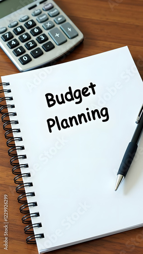 A notebook with the words budget planning written on it sits on a wooden table next to a calculator and a pen, symbolizing financial organization