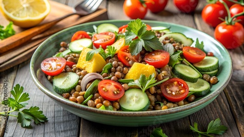 A nourishing lentil salad with cherry tomatoes, cucumber, and lemon dressing.