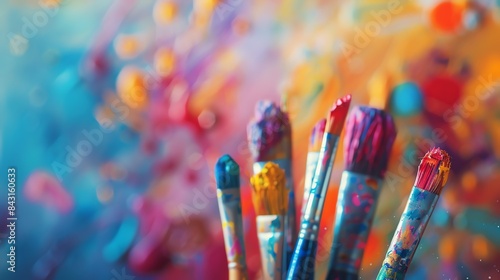 A paintbrush with red, blue, and yellow paint on it is held in front of a blurred background of multicolored lights.
