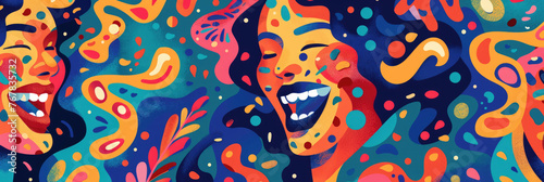 group, people, laughing, individual, joy, happiness, camaraderie, painting, artwork, colourful, emotion, expression, friends, socialising, gathering, cheerful, fun, enjoyment, laughter, bond, community, multicultural, joyful, celebration, togetherness, festive, energetic, dynamic, lively, humor, positive, occasion, expressive, canvas, artist, gallery, auction, event, cultural, ethnic, happy, smiling, collective, amused