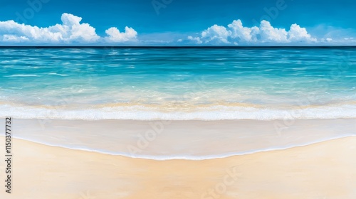 A painting of a beach scene with a blue sky and white clouds