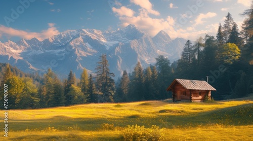 a painting of a cabin in a field with mountains in the background and trees in the foreground and grass in the foreground.