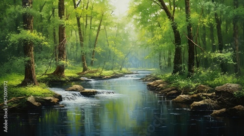 river, oil, painting, forest, tall, tree, idylli, natural, landscape, lush, winding, tranquil, foliage, serene, picturesque, flora, scenic, grassy, calmness, wilderness, sylvan, vista, greenery, verdant, pastoral, horizon, seascape, majestic, bucolic, peaceful, ai, generative, illustration, digital, art